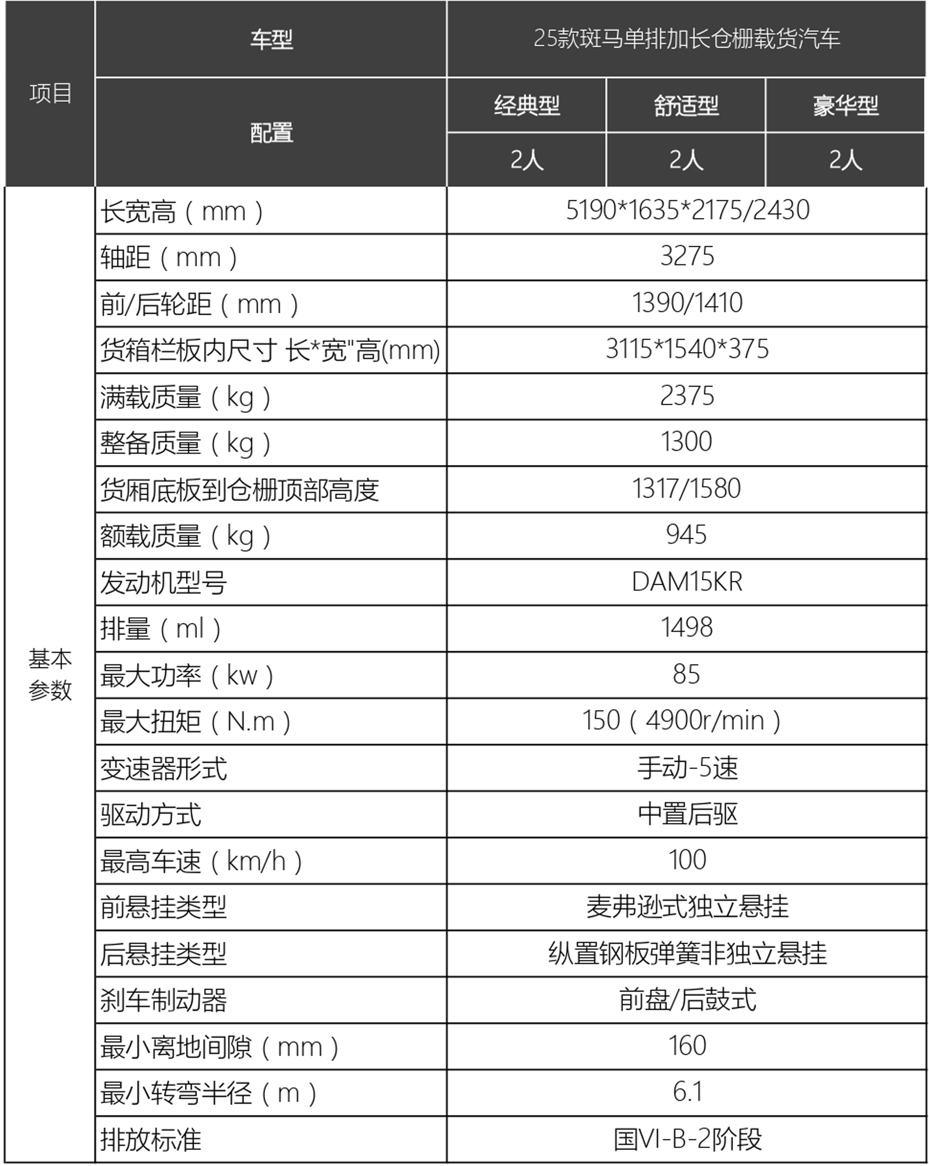 25款斑马仓栅 车型配置
