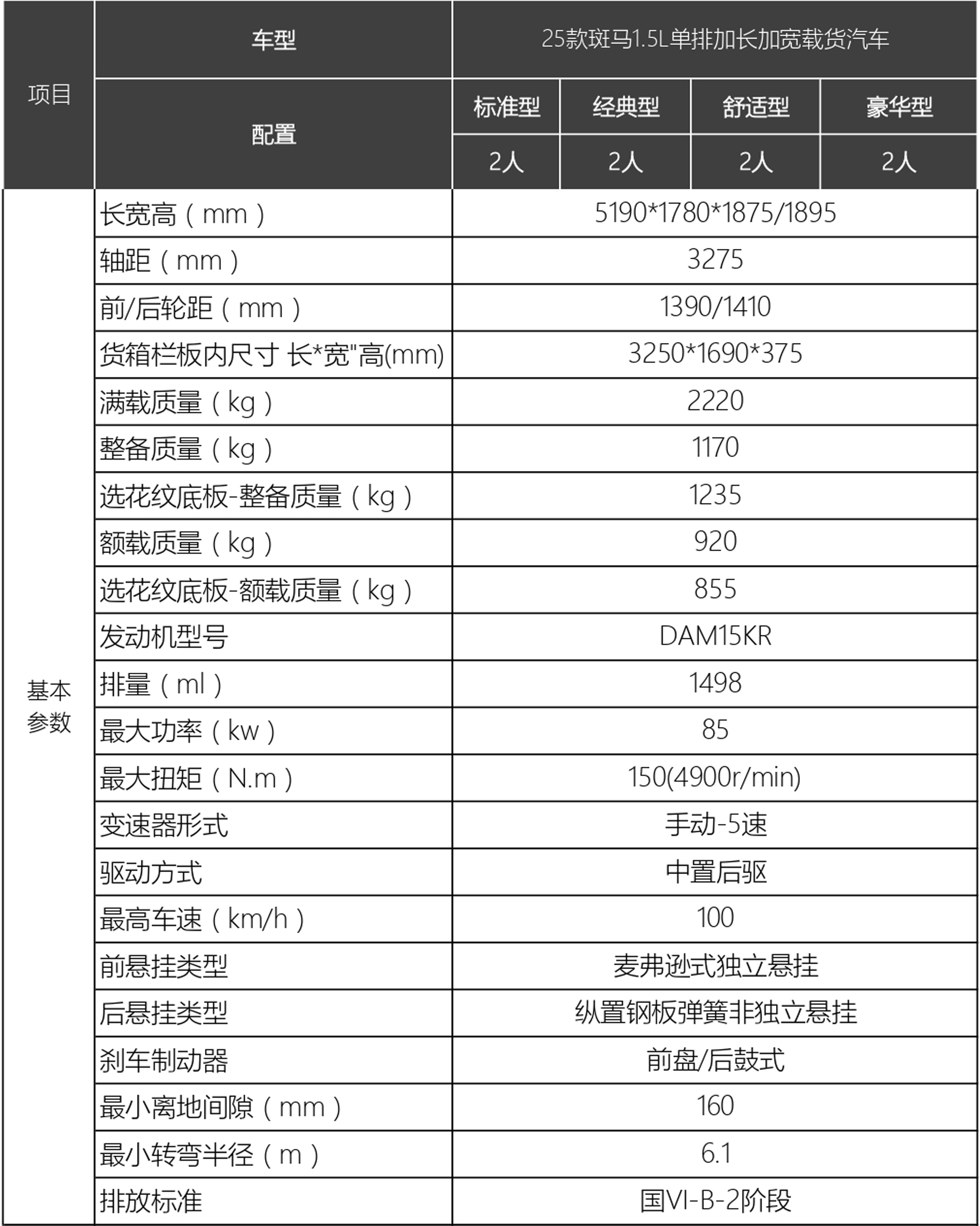 25款斑马CNG单排 车型配置